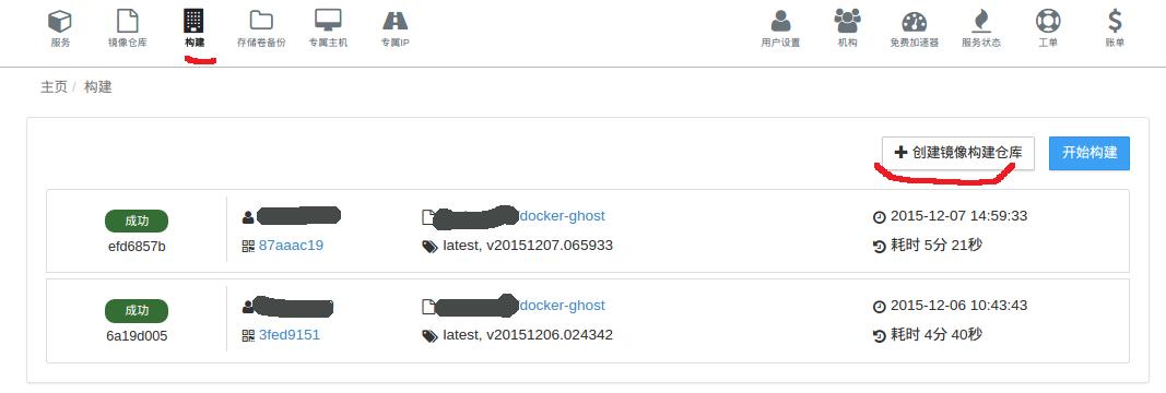点击“创建构建镜像仓库”,授权读取Github中的repo,选择ghost对应的项目构建即可。
