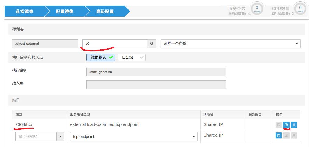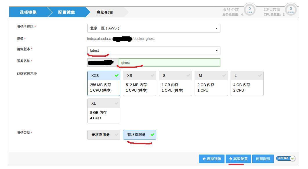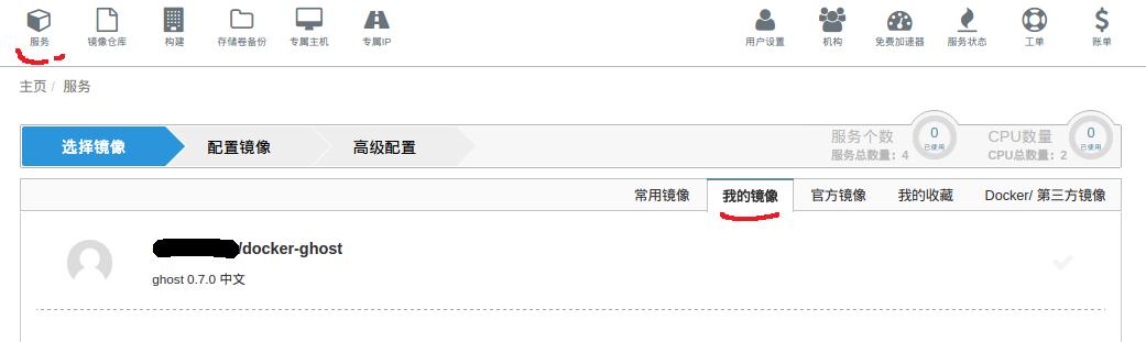 然后在“服务”中选择“创建服务”,会提示用户选择镜像,选择“我的镜像”中刚才构建好的docker-ghost,